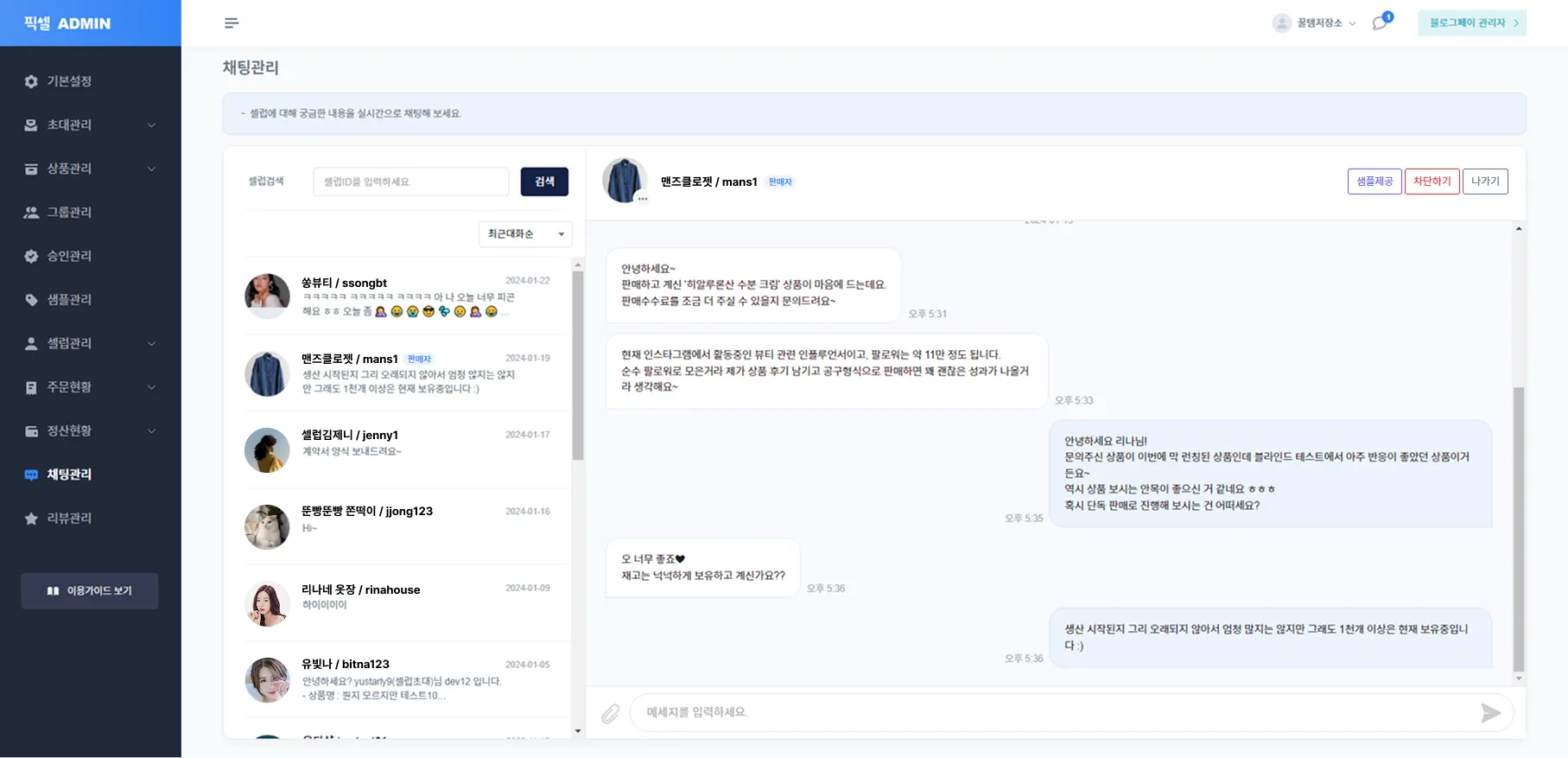 페이지에서 인플루언서와 나눈 채팅내역을 확인할 수 있고, 원하는 채팅내역을 클릭하여 채팅을 진행할 수 있습니다.