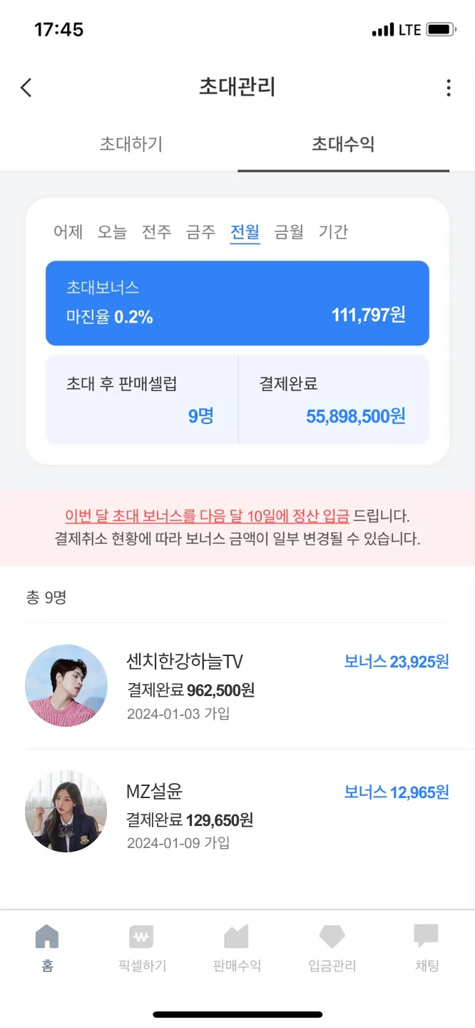 초대 보너스는 다음달 10일에 일괄 정산 지급됩니다.