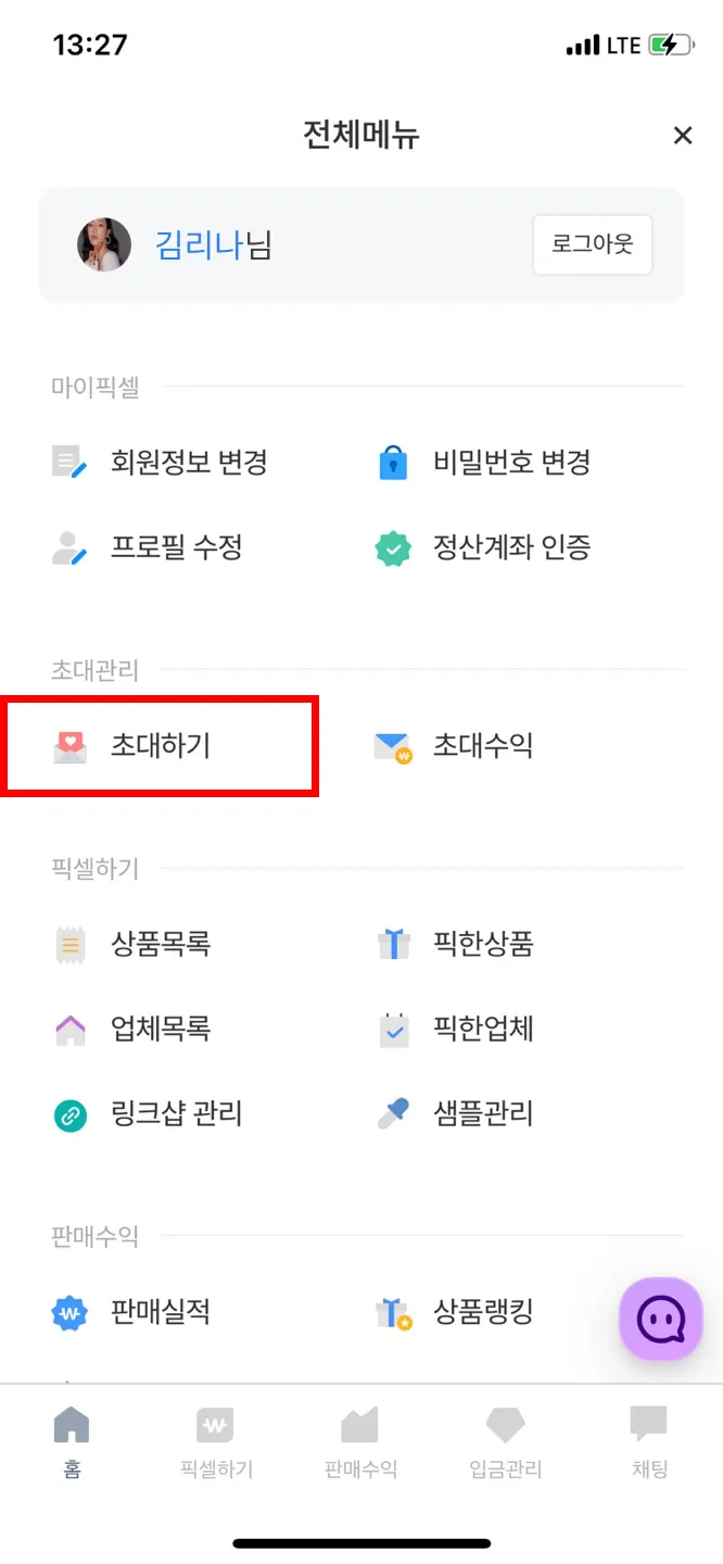 홈화면에서 인플루언서 초대하기 영역 또는 [전체메뉴 > 인플루언서 초대관리 > 초대하기] 메뉴를 눌러 초대하기 화면으로 이동하세요.