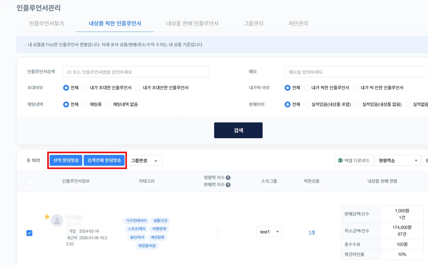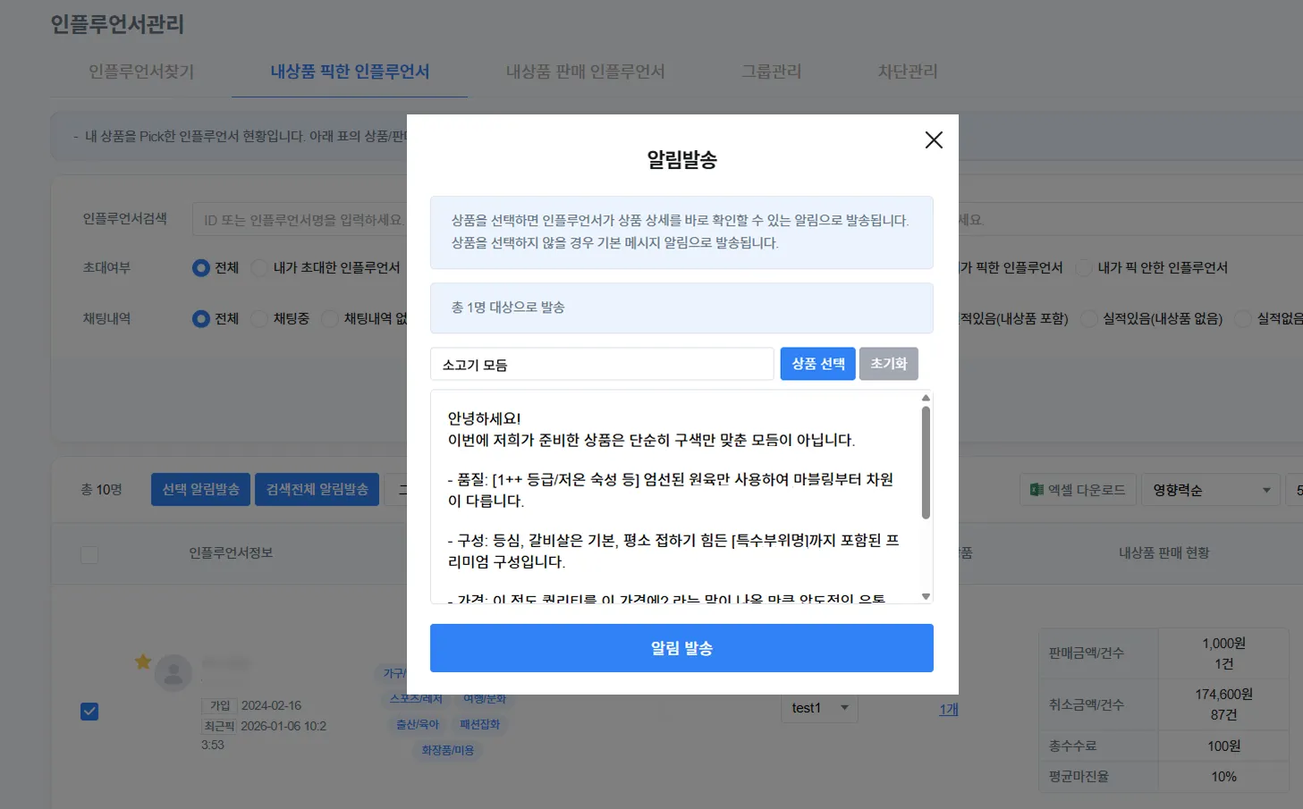 내상품 픽한 인플루언서, 내상품 판매 인플루언서, 그룹관리, 인플루언서별 주문현황 페이지에서 공통으로 알림발송 기능을 사용할 수 있습니다.