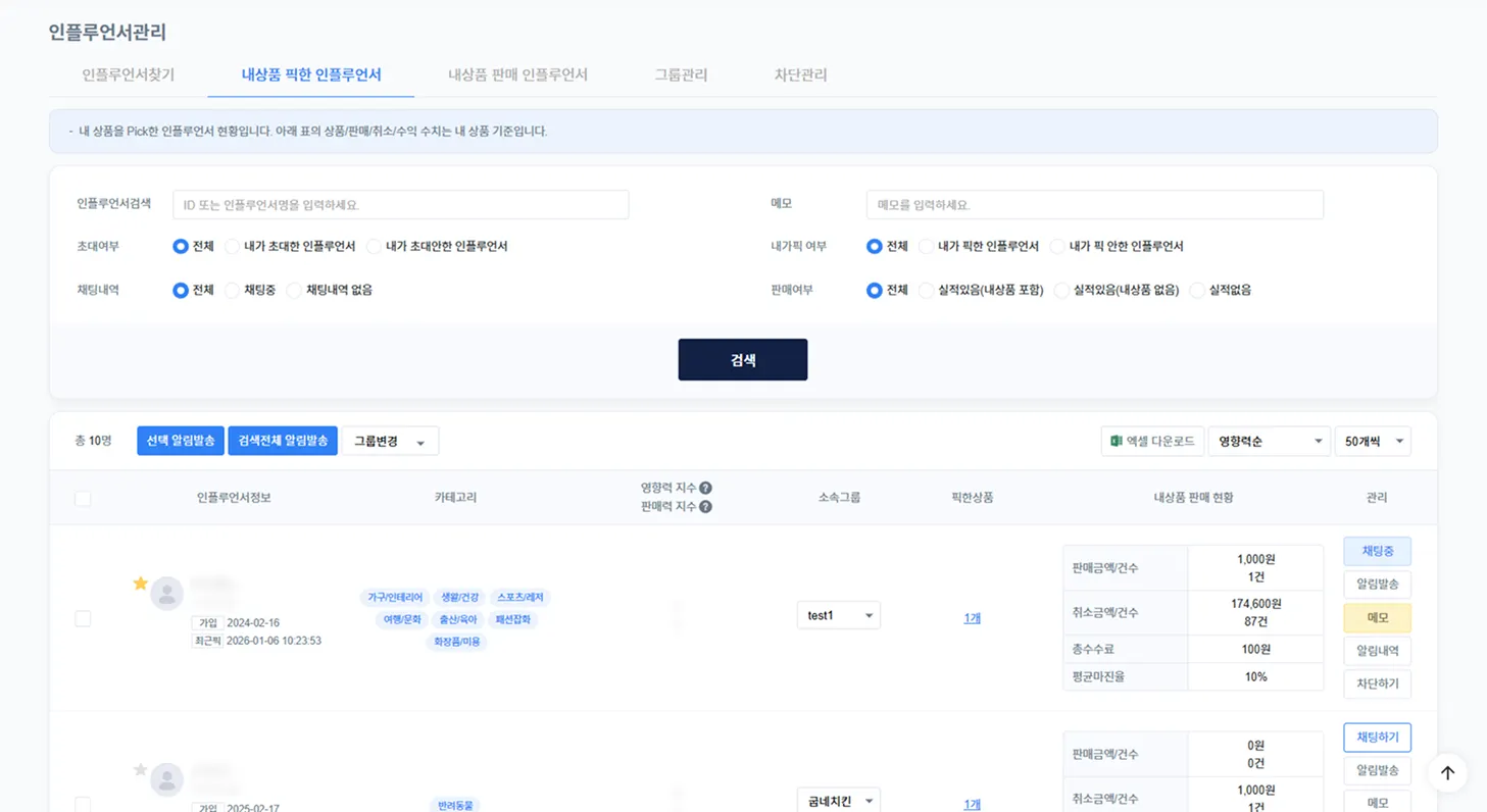내상품을 Pick한 인플루언서만 모아서 볼 수 있는 페이지입니다. 추가로 페이지 상단 탭메뉴에서 내상품을 판매한 인플루언서를 볼 수 있는 페이지도 볼 수 있습니다.