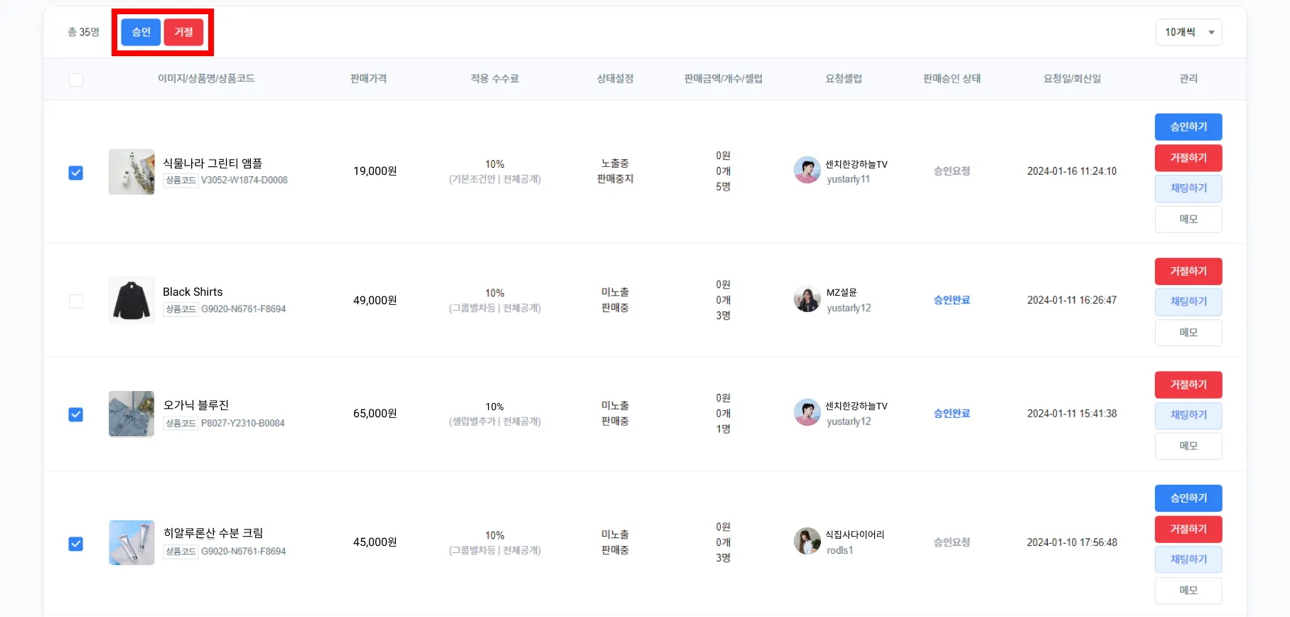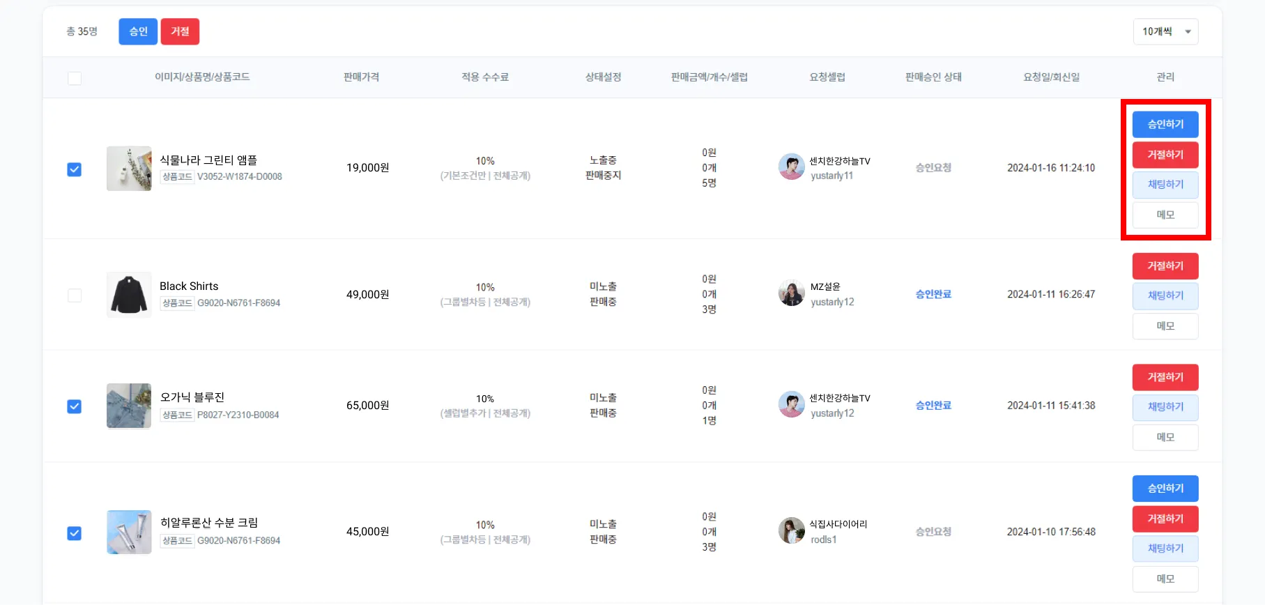 승인관리 리스트에서 인플루언서가 요청한 상품승인내역을 확인하세요.