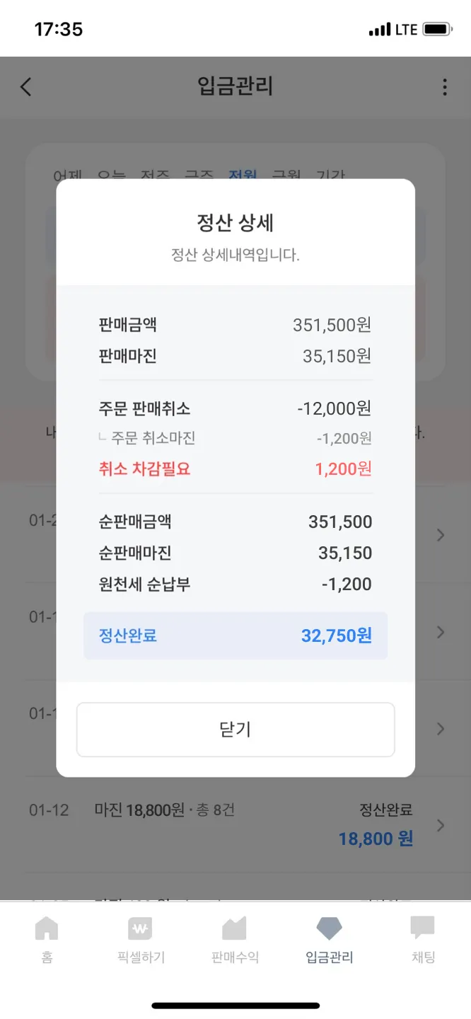내가 판매한 상품에서 발생한 판매수수료에서 실제 입금받은 내역, 앞으로 입금 받을 내역과 입금 받은 후 취소되어 차감 필요한 내역까지 모두 확인할 수 있어요.