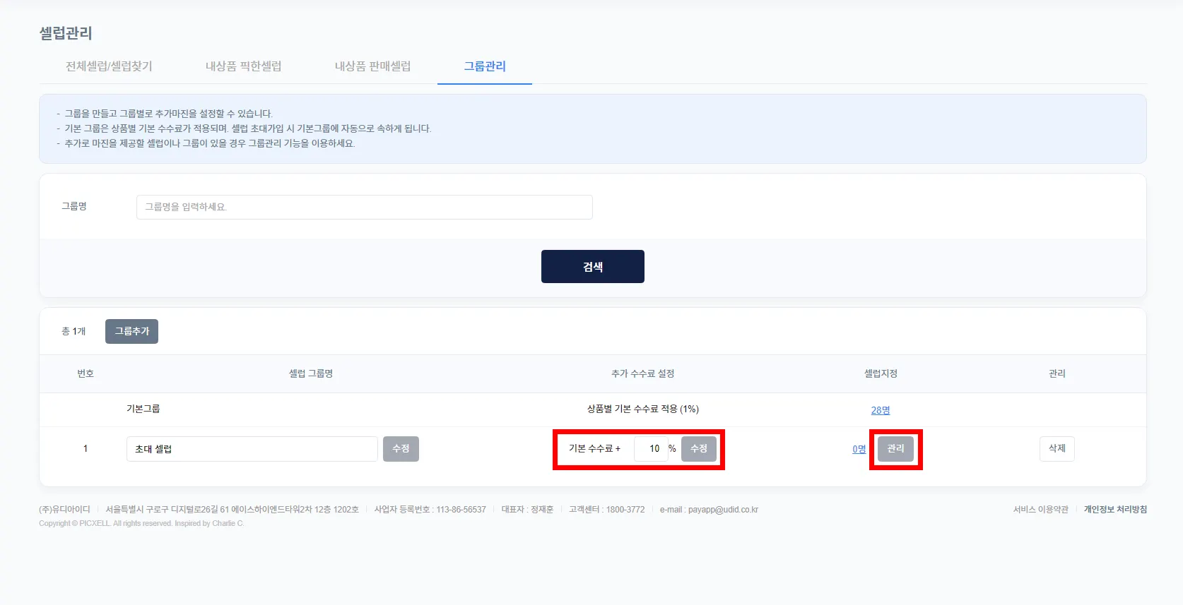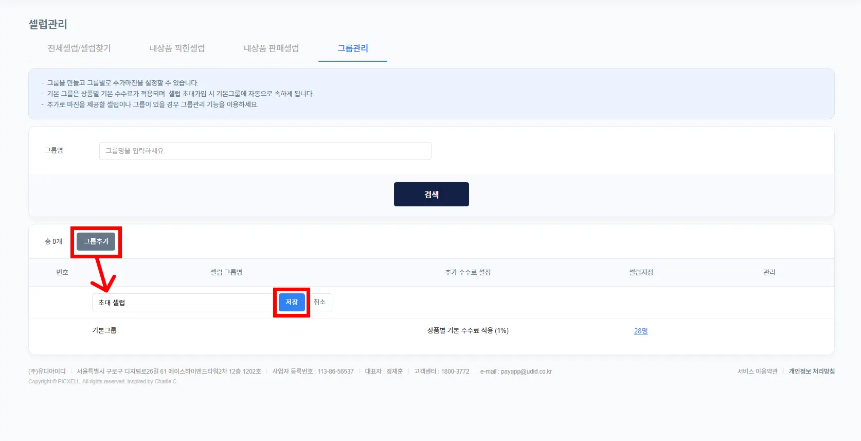 생성한 그룹에 대해 추가 수수료를 주고 싶을 경우, 추가 수수료 입력란에 값을 입력하고, 수정 버튼을 클릭하시면 됩니다.