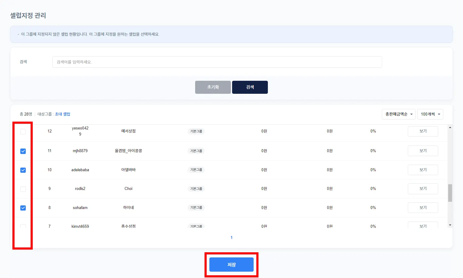 그룹에 추가할 인플루언서를 검색하여 체크 선택한 후, 저장 버튼을 클릭하면 인플루언서 지정이 완료됩니다.